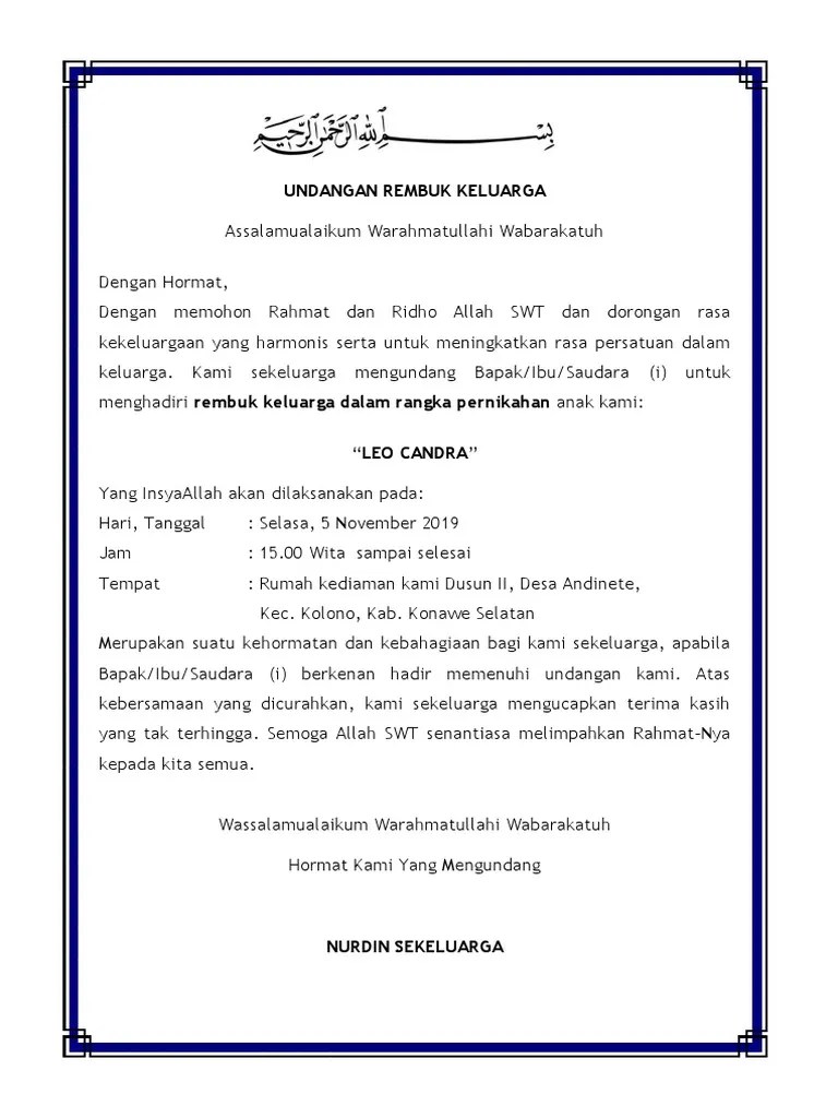 Karena yang diundang adalah keluarga sendiri . Contoh surat undangan musyawarah keluarga. Undangan biasanya dibuat oleh pengurus yang ditunjuk dalam sebuah organisasi, seperti pada lingkungan rw dan rt. Saya mengucapkan banyak banyak terima kasih, kepada narasumber dan undangan yang sudah menyempatkan hadir dalam acara rembuk stunting ini, . Demikian undangan kami atas perhatian serta kerjasamanya .